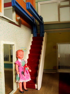 At the bottom of the stairs is Wilma, who was given to me last week and who I think would be right at home living in this house. See, once again the Universe is conspiring against my "no dolls" rule!And I think I've made a decision on the wiring situation. I'm going to keep the lights and the wiring but plan to carefully remove the wires from under the carpet and paper flooring, glue the flooring back down and then reroute the wiring across the ceiling below using U shaped basswood pieces to contain it neatly.